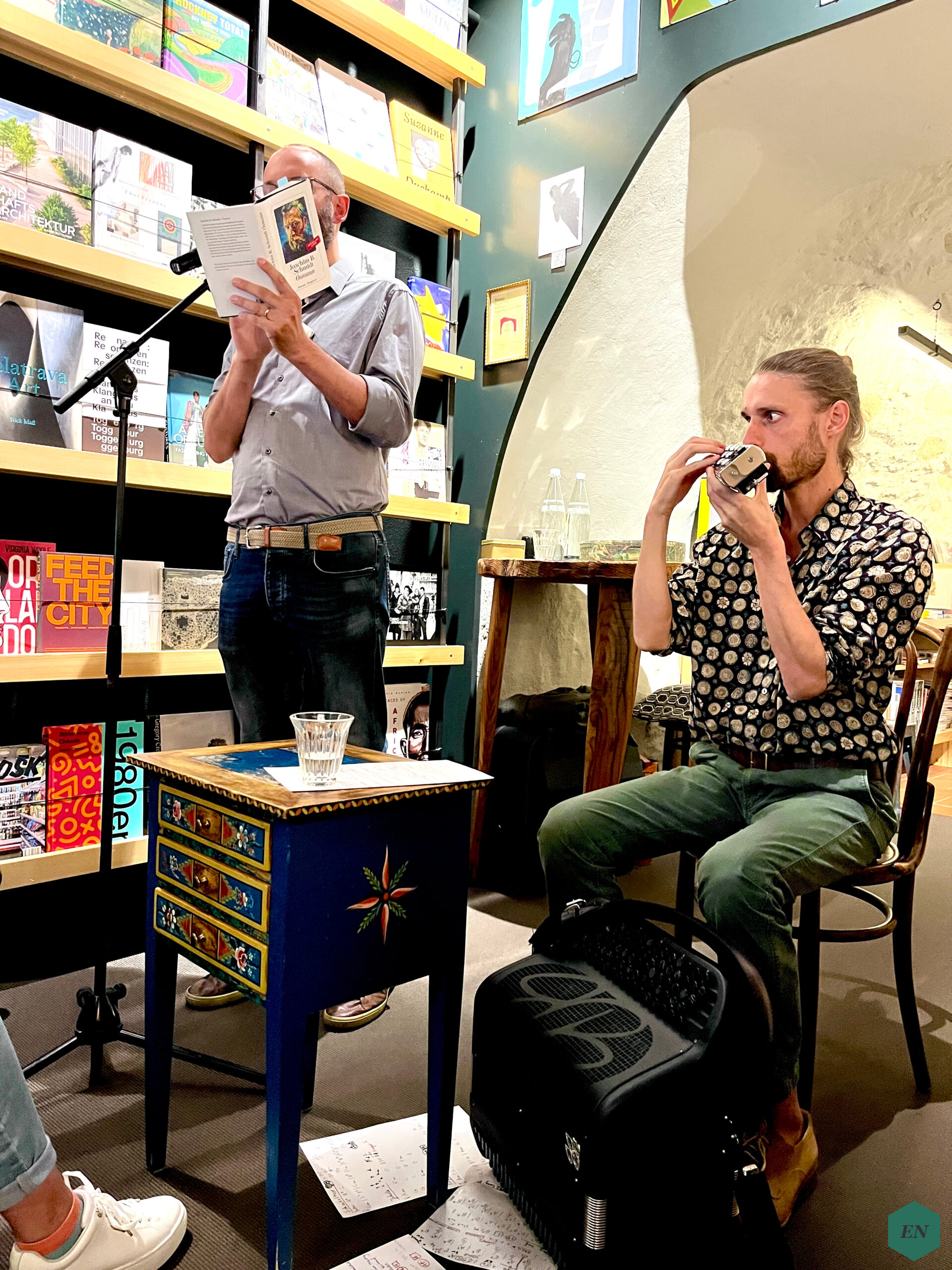 So ließen sich auch weder der Autor noch die Zuhörer*innen aus der Ruhe bringen, als zwischendurch minutenlanges lautes Glockengeläut erklang – Schmidt baute dieses sogar noch auf geschickte und humorvolle Weise in einen Satz des Romanabschnitts ein, den er in dem Moment vorlas. Dann begrüßte der Autor sein Publikum gut gelaunt und stellte seine musikalische Begleitung des Abends vor: Der Schriftsteller und der Akkordeonist Tom Egger kennen sich schon viele Jahre und hatten bereits für Schmidts frühere Romane In Küstennähe und Am Tisch sitzt ein Soldat zusammengearbeitet und im Falle von Ósmann lag es nun besonders nahe, dass Egger erneut eigene Lieder für den Roman seines Freundes komponierte, schließlich spielte die Hauptfigur, sprich der echte Ósmann, selbst Akkordeon. Mal am Akkordeon, mal an der Melodica spielte Egger zwischen den einzelnen Lesepassagen verschiedene Stücke, die bisweilen in Schmidts Worte übergingen und andersherum – Lieder, von denen ich nicht wusste, dass ich bzw. der Roman sie brauchte – und doch trafen diese Melodien genau den Kern der Geschichte: Sie klangen melancholisch und sehnsuchtsvoll, lebensprall und gewaltig, rau und manchmal auch düster, aber immer wieder hoffnungsvoll und manchmal alles davon auf einmal, während dazwischen sogar noch die Elemente und die Landschaft Islands inklusive Wind und Wetter selbst noch ihren eigenen Platz in den Stücken gefunden zu haben schienen. Tom Eggers einfühlsame Musik stellte eine rundum gelungene Ergänzung zu Joachim B. Schmidts eindrucksvollem Roman dar und auch wenn es für mich längst nicht die erste Lesung mit musikalischer Begleitung war, haben Text und Musik möglicherweise noch nie so wunderbar und magisch ineinandergegriffen wie dieses Mal.