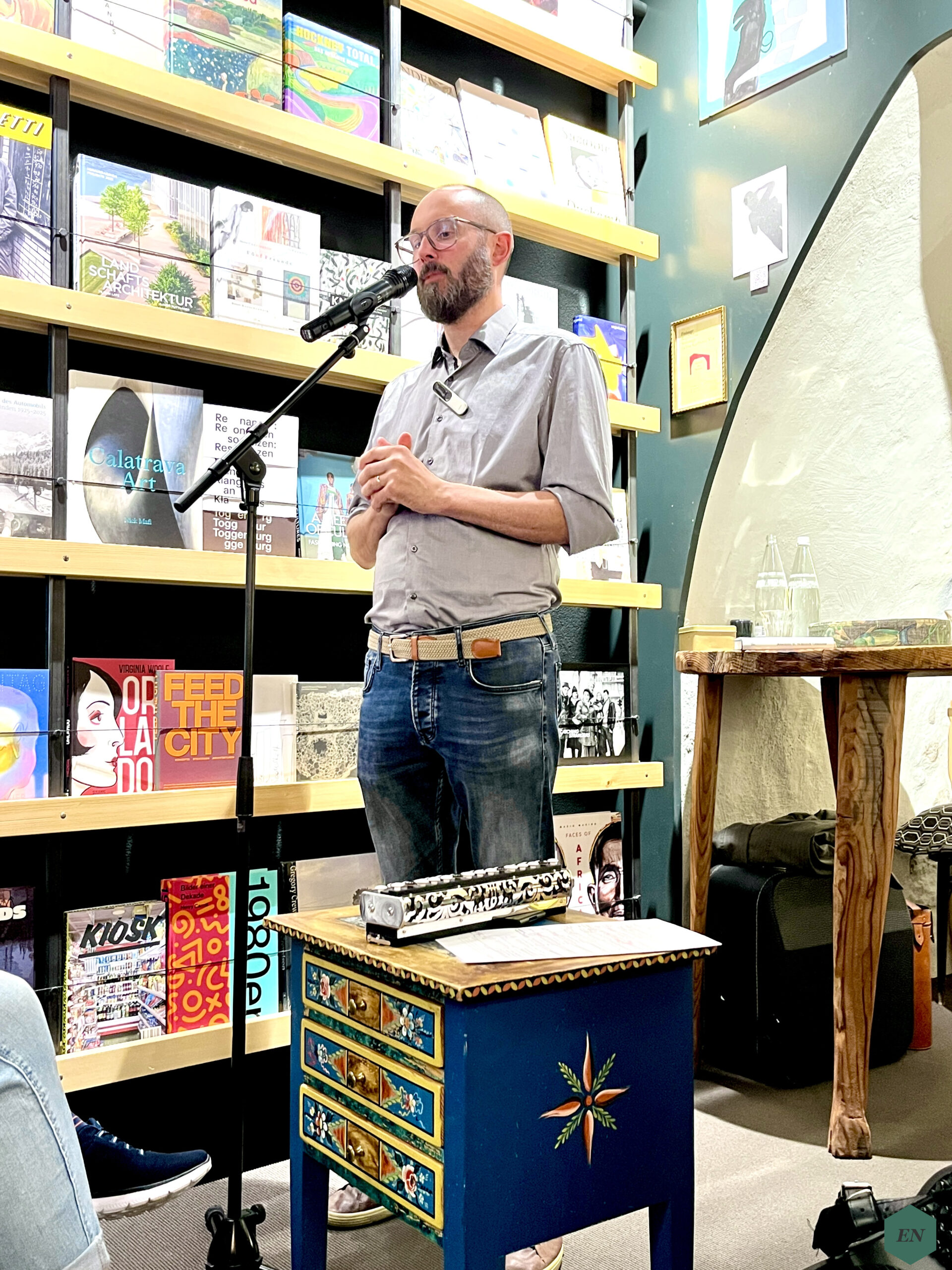 Man könnte fast sagen, der ursprünglich aus Graubünden stammende und seit vielen Jahren in Island lebende Autor ist schon Stammgast im Appenzeller Bücherladen: Dreimal hat er bereits vor Ort gelesen, einmal war er online zugeschaltet, und auch diesmal lockte er wieder viele treue Leser*innen an, die den schmalen gewölbten und dadurch beinahe höhlenartigen Raum der Buchhandlung dicht an dicht bevölkerten und ihn mit einem leisen Stimmengewirr füllten, das sich nach und nach in eine gespannte Stille verwandelte. Die fast schon intime Atmosphäre und die volle Besetzung machten die gespannte Erwartung noch intensiver spürbar, sodass ein fast greifbares Knistern im Raum lag, als die Lesung begann. Noch bevor die ersten Worte des Prologs erklangen, setzte Schmidt mit seiner Meerestrommel ein, die ein sanftes Rauschen erzeugte, das an das rhythmische Rollen der Wellen am Strand erinnerte. Dazu ließ der Musiker Tom Egger, der Schmidt an diesem Abend musikalisch begleitete, leise Akkordeontöne erklingen, die sich wie eine feine Melodie über das Rauschen legten. Direkt fühlte man sich an die raue Küste Islands versetzt und es war nicht mehr schwer, sich vorzustellen, wie der Wind durch den Raum wehte. Die Atmosphäre war fast hypnotisch und zog die Zuhörer*innen sofort in die Welt von Ósmann hinein, zumal auch der Übergang in die folgenden Lesepassagen nahtlos war: Joachim B. Schmidt begann, den ersten Teil des Romans zu lesen, während Egger zunächst noch leise Begleitklänge spielte, dann übernahm Schmidts berührende Geschichte über den legendären isländischen Fährmann Jón Magnússon Ósmann schließlich die volle Bühne, füllte den Raum dank Schmidts nuancierter und mitreißender Art des Vortrags auf ihre ganz eigene Weise und zog das Publikum vollständig in ihren Bann.